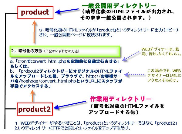 さらに、サーバサイドSHTMLでは、動的なHTMLソースのみならず、静的なHTMLファイルのリアルタイム更新(もしくは、短時間内の更新反映)という御用途にもご利用いただけます。具体的な方法は下記の通りです。 静的なHTMLファイルのリアルタイム更新用のPHPプログラムのファイル名をここでは、convert_html.phpとします。このconvert_html.phpでは、特定のディレクトリー(フォルダー)内(「ディレクトリーA=『product2』」と呼びます。作業用ディレクトリー)にアップされているHTMLファイルを、サーバサイドSHTMLのライブラリを使って、特定のフォルダー(一般公開用のディレクトリー。「ディレクトリーB=『product』」と呼びます。)に一括で出力するプログラムにしておきます。(「サーバサイドSHTML」Advancedコースに付属の「特定フォルダー内のHTMLファイルの一括更新プログラムのサンプル」を参考にしていただくといいと思います。)後は、編集・更新したオリジナルのHTMLファイルをディレクトリーA(上記挿絵でいうところの「product2」という名称のディレクトリー)にまとめてアップし、convert_html.phpを何らかの手段で実行すれば、一般公開用のHTMLファイルが更新されます。convert_html.phpを実行させる方法(上記挿絵の「2.難読化の方法」に該当。)は、手動が面倒であればcronでもできるでしょうが、頻繁に更新されない場合には、cronの実行頻度に気をつけられないと、サーバに思わぬ負荷をかける場合がありますのでご注意ください。 なお、CGI版PHPでないPHPをご利用の場合、ブラウザ経由でURLを入力してconvert_html.phpを実行する場合(= http://お客様サーバ名/〜/convert_html.phpへのアクセス。上記挿絵でいうところの「『2.難読化の方法』の『b』」)、ディレクトリーB(上記挿絵で言うところの「product」という名称のディレクトリー)やその中のHTMLファイルのパーミッションに注意しなければなりません。websuerに対して書き込み権限を与えなければ動作しませんが、セキュリティ上、好ましくない場合もありますから、一括更新する時のみ、一時的にパーミッションを変更し、すぐに元に戻すなどした方が良いでしょう。 この方式のメリットは、WEBデザイナーの方でプログラムの知識がまったくない方でも、普段どおりにFTPソフトでHTMLファイルを特定のディレクトリーにアップするだけで、cronを使えば完全自動で(convert_html.phpへ手動でアクセスする場合でも、きわめて簡単な方法で)、難読化が可能だということです。convert_html.phpのプログラムをプログラマーが一つ準備するだけで、ホームページのデザイナーが負担する作業は、アップするディレクトリーが今まで(=公開用ディレクトリー)と違う(ex. 今まで、「product」というディレクトリーにアップしていたものを「product_for_shtml」とか「prodcut2」にアップする)だけで、その他の特別な作業が一切不要になることです。 なお、この方法を使用する場合、作業用のディレクトリー(=オリジナルのHTMLファイルをアップロードするディレクトリー。上の例で言えば、「prodct_for_shtml」や「product2」のディレクトリー)にあるファイルに、一般の方がブラウザ経由でアクセスできると問題がありますので、.htaccessで、ブラウザ経由ではアクセスできないようにしていただくか、そもそもproduct2というディレクトリーをDocumentRootの下に置くのではなく、ブラウザ経由ではアクセスできないDocumentRootより上に置くようにしてください。ご不明の点は、サポートにお問い合わせください。 |